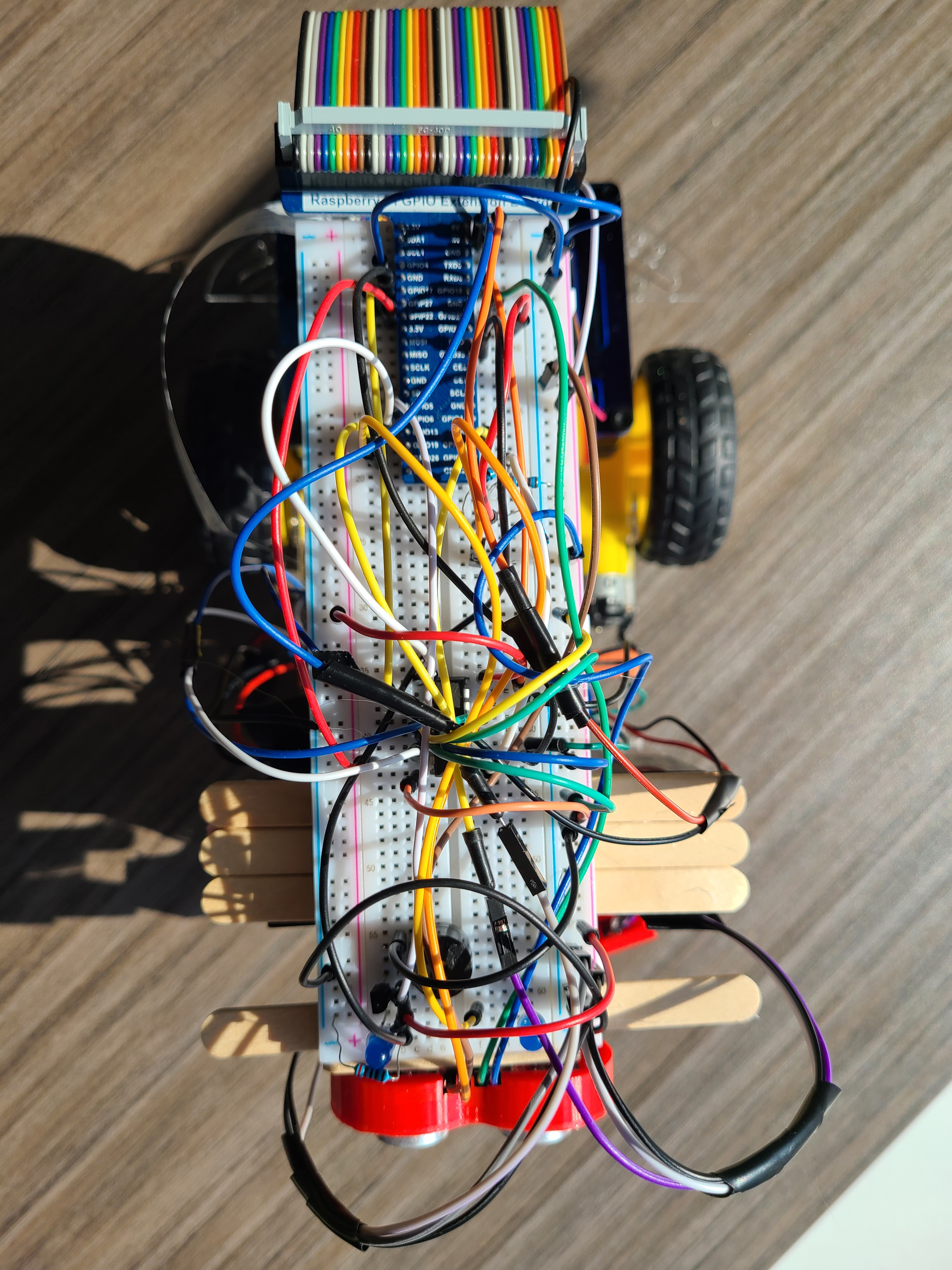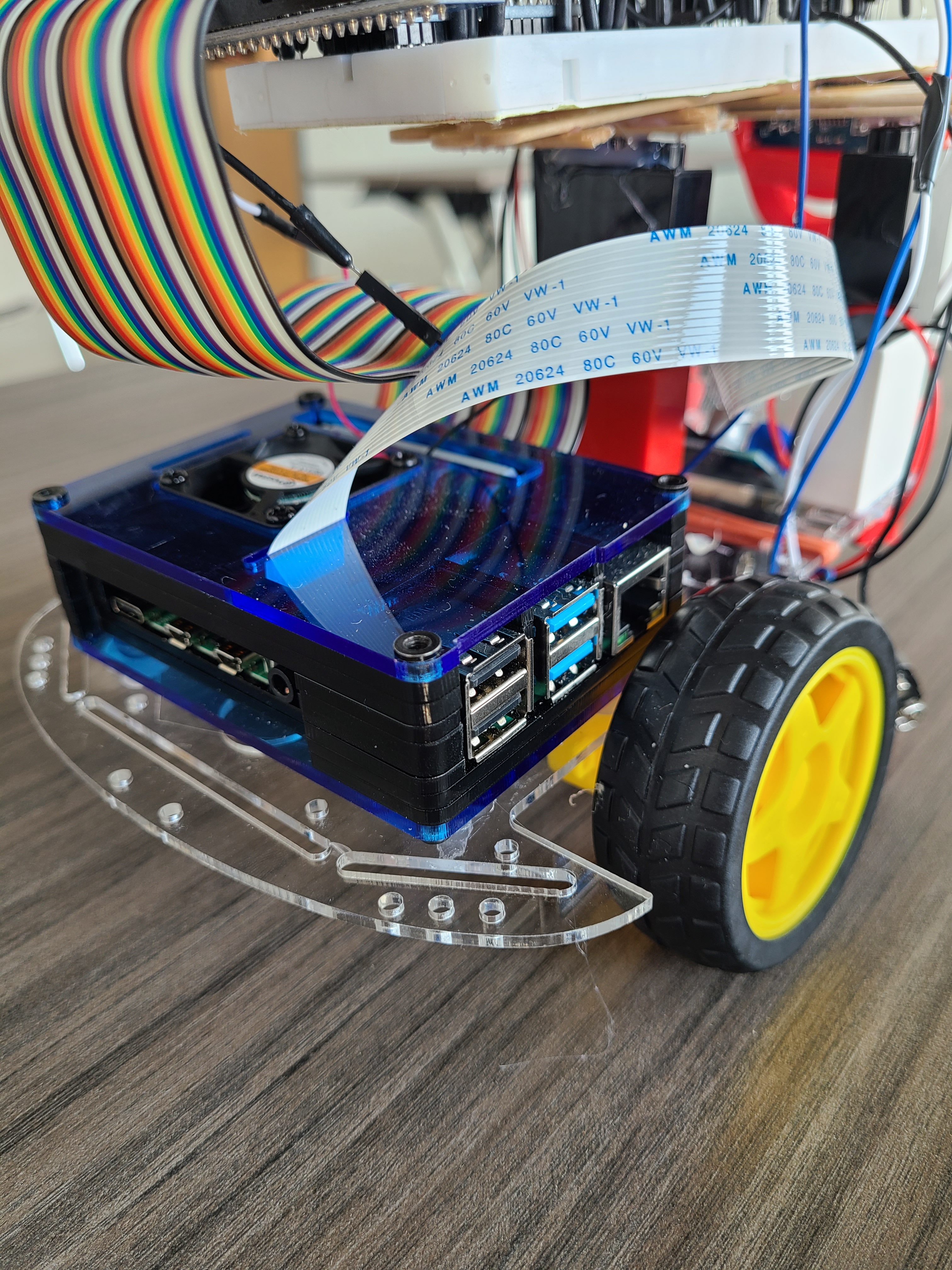 The brains of the vehicle lie within the onboard Raspberry Pi which acts as a small computer. Connected to it are a wide assortment of sensors and outputs such as: the motors, an 8 MP camera, an ultrasonic sensor module, a pair of infrared sensors, a pair of lights, and a loud horn. Due to the relative small computational power of the Pi, it acts as a means of sending the sensor values to the remote PC and receiving the corresponding commands.
