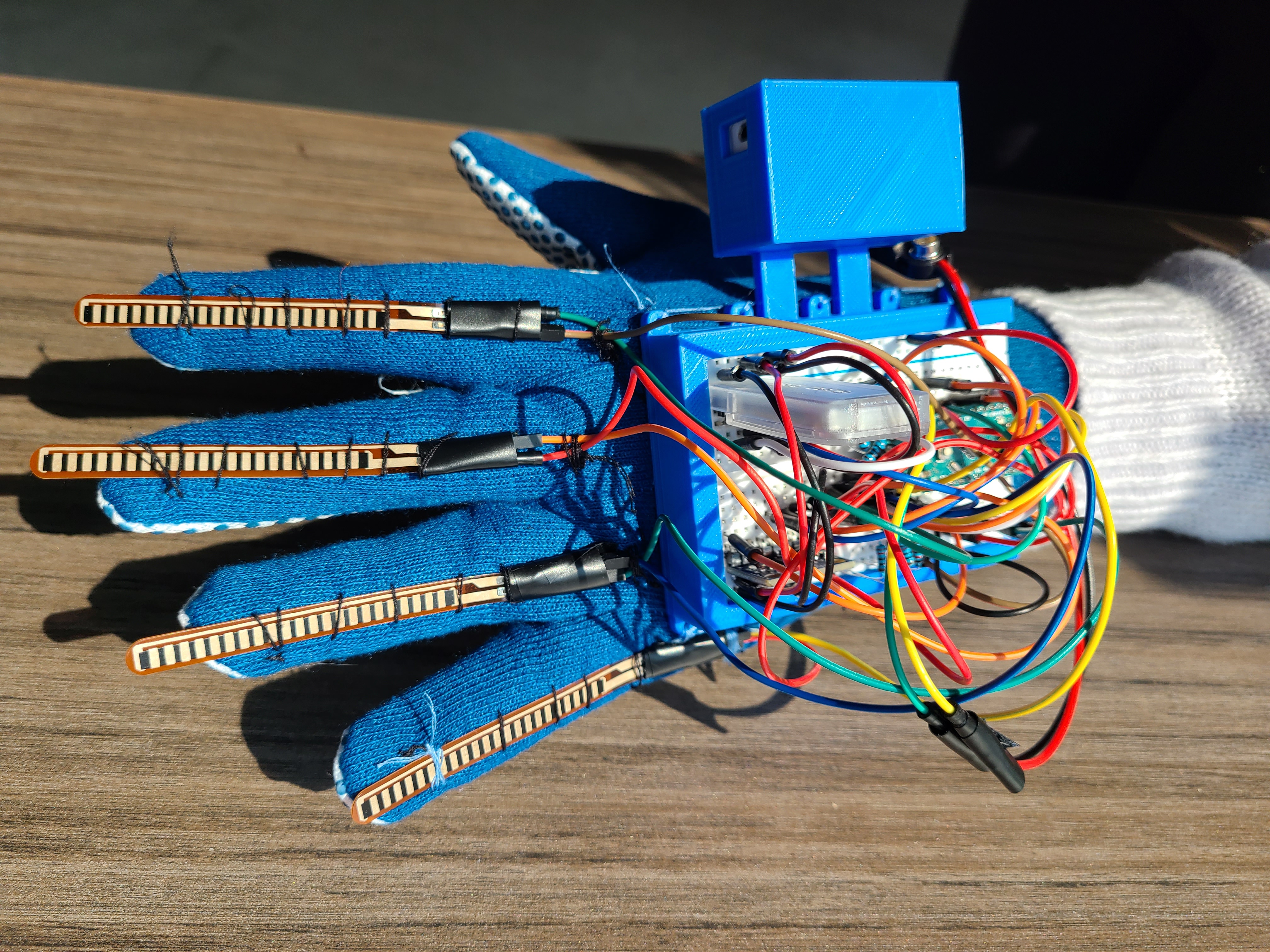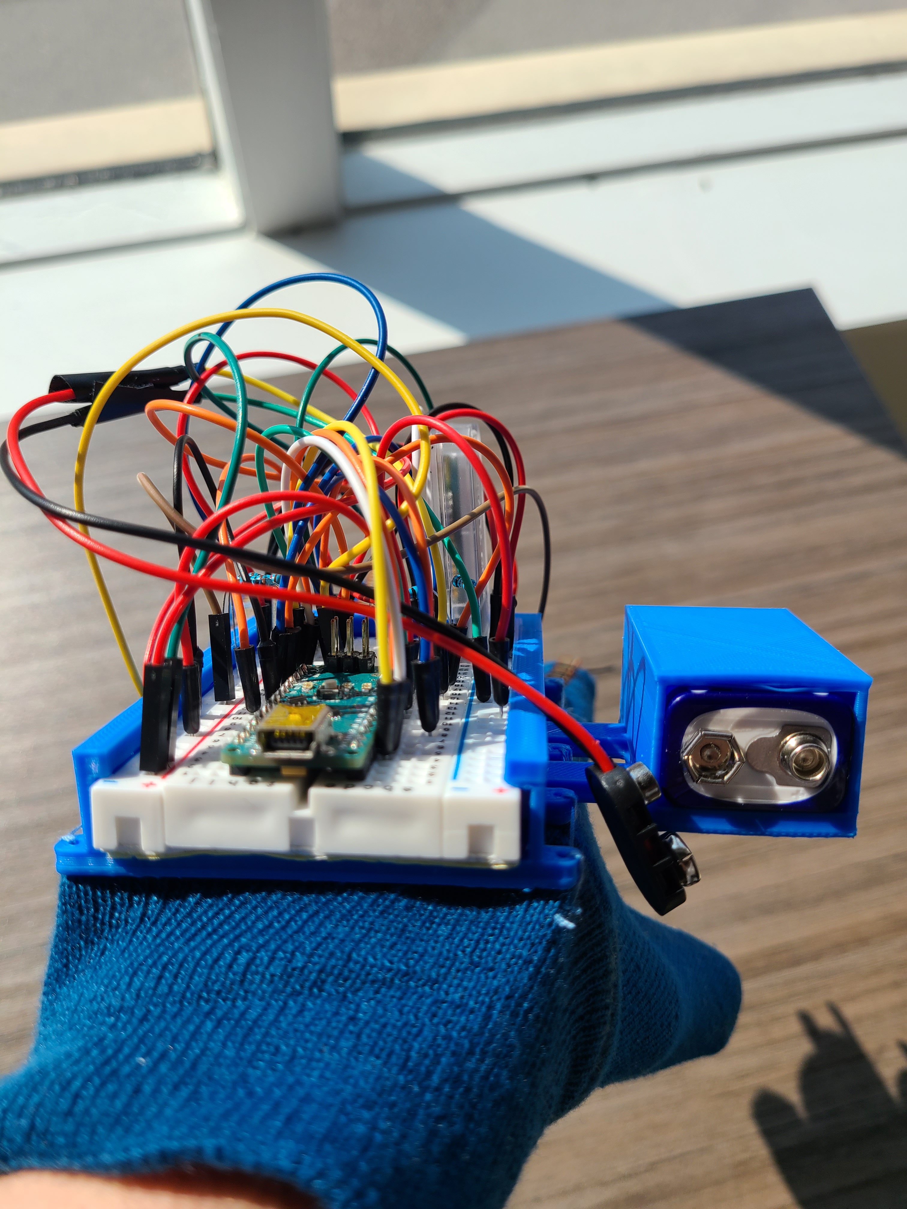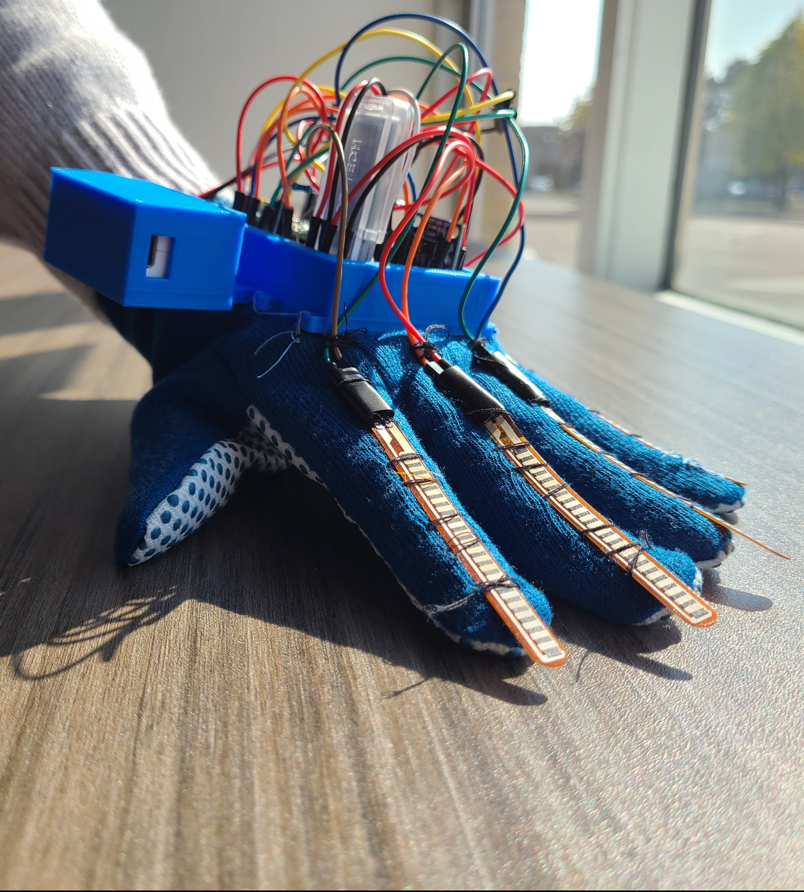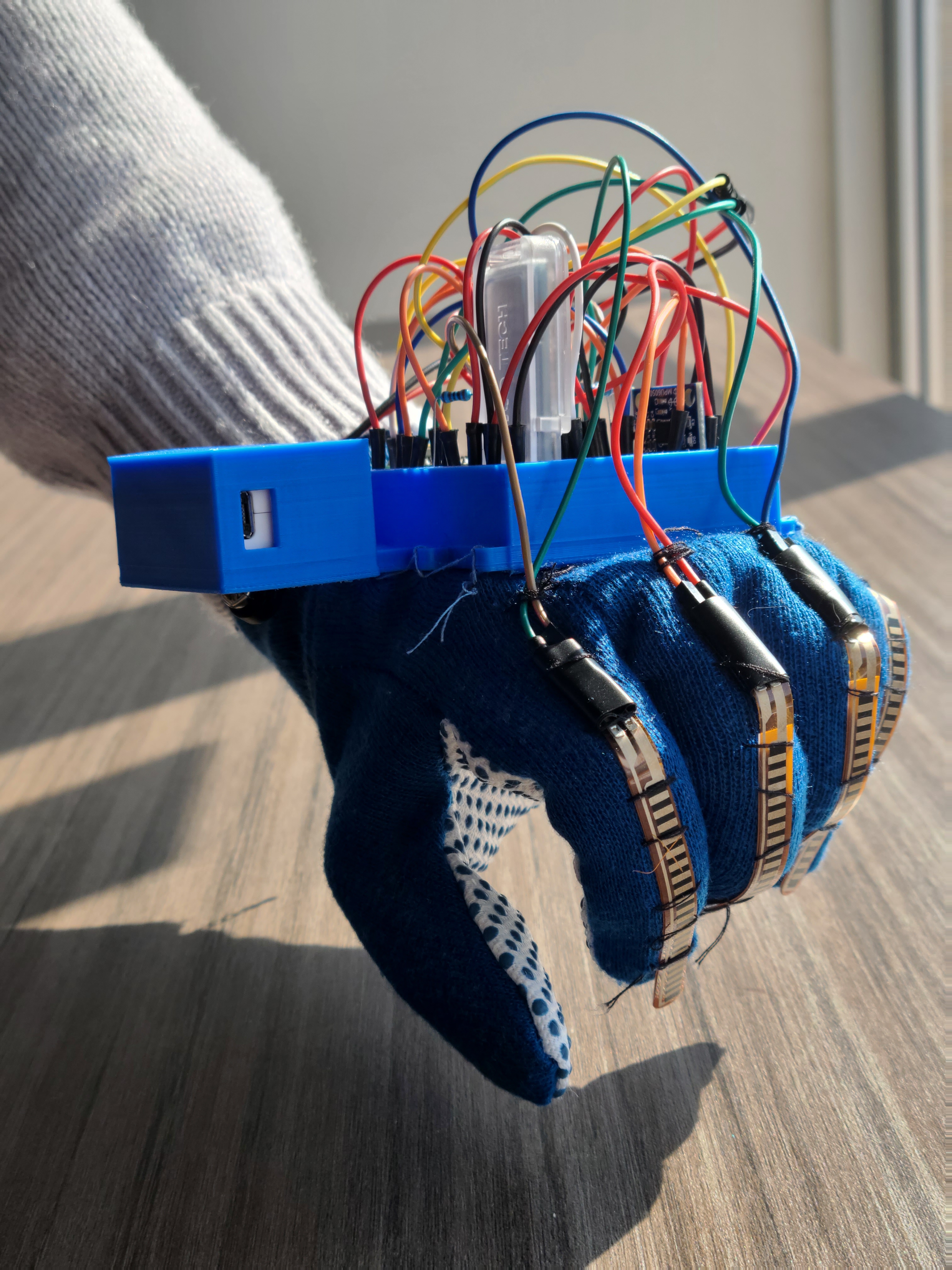 The primary goal of the glove was to provide a simple interface for a user to control the glove without much prior knowledge. By measuring the tilt of the hand, the commands are sent for how the robot should move. To further customize the interface, the simple bending of each finger has an associated command: the pinky activates the lights; the ring finger sounds the horn; the middle finger activates the autodrive mode that navigates around a room while avoiding obstacles; and the index finger commands the robot to follow a pre-determined path on the floor by following a complex black line. After measuring the user’s movements, these commands are processed by an Arduino and sent to the PC via Bluetooth. To hold all the components, we 3D printed a custom model to keep everything secure.